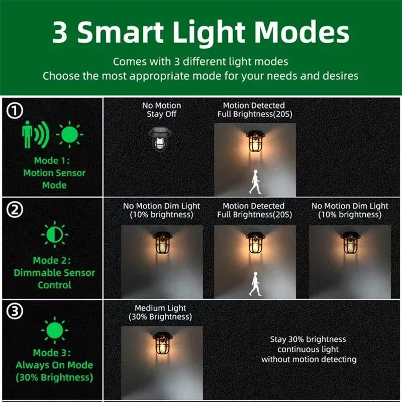 *Multiple Lighting Modes: Motion sensor mode, dimmable sensor mode, full brightness mode, a variety of modes for a variety of scenes